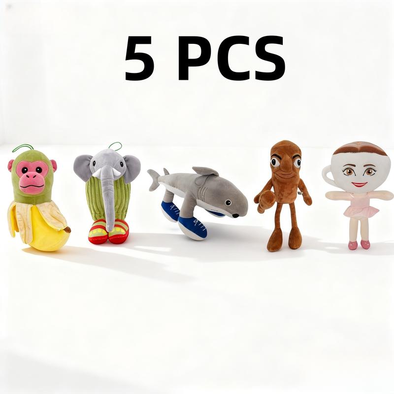 You will receive all 5 characters shown in the product images: Monkey Banana, Elephant, Shark, Coffee Girl, and the Brown Mascot.
